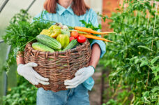 Farmer young woman holding wooden basket full of fresh organic vegetables. Full Box with vegetable (cucumbers, garlic, carrots, tomatoes, greens and peppers) in female hands.
