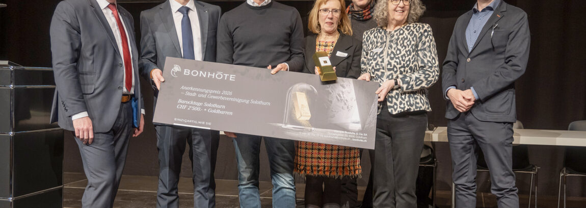Die Stadt- und Gewerbevereinigung Solothurn (SGSo) vertritt Geschäfte, Firmen, Institutionen und Personen, um mit starker Stimme deren Interessen für die Stadt als regionales Zentrum zu vertreten. Von den knapp 500 Mitgliedern nahmen etwa 150 an der 17. ordentlichen Generalversammlung in der Rythalle teil. Höhepunkt war wiederum die Verleihung des erstmals von der Bank Bonhôte gestifteten Anerkennungspreises in Höhe von 2500 Franken mit einem Goldbarren dazu. Der Preis ging an die Organisatoren der Barocktage. Präsident Andreas Affolter nahm die Auszeichnung stellvertretend für über 30 Personen und Institutionen entgegen, die mit mehr als 400 Veranstaltungen jeweils im August den Barock erlebbar machen. Weiter traktandiert waren nebst den ordentlichen statutarischen Geschäften das im Juni wieder stattfindende Stadtfest, Informationen zum Bezahlsystem VERD und der Umbau der Rythalle. Vor allem aber beschäftigte die Kriminalität sowohl das Gewerbe als auch die Stadtpräsidentin. So erwähnte Stefanie Ingold in ihrem Grusswort denn auch die im Gemeinderat kürzlich beschlossenen Massnahmen, damit sich das Gewerbe als «eines der Herzen von Solothurn», aber auch die Bevölkerung wieder sicherer fühlen.